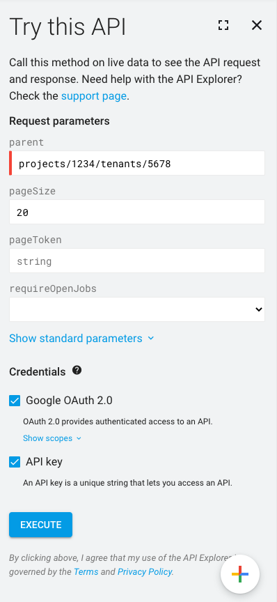Pode usar a ferramenta API Explorer para enviar pedidos de teste para a Cloud Talent Solution. O Explorador apresenta um formulário que mostra os parâmetros de cada método. Preencha o formulário, execute a chamada API e veja os resultados. Tem de ter concluído a secção "Configuração da consola GCP" da página Antes de começar antes de poder usar o Explorador de APIs.
