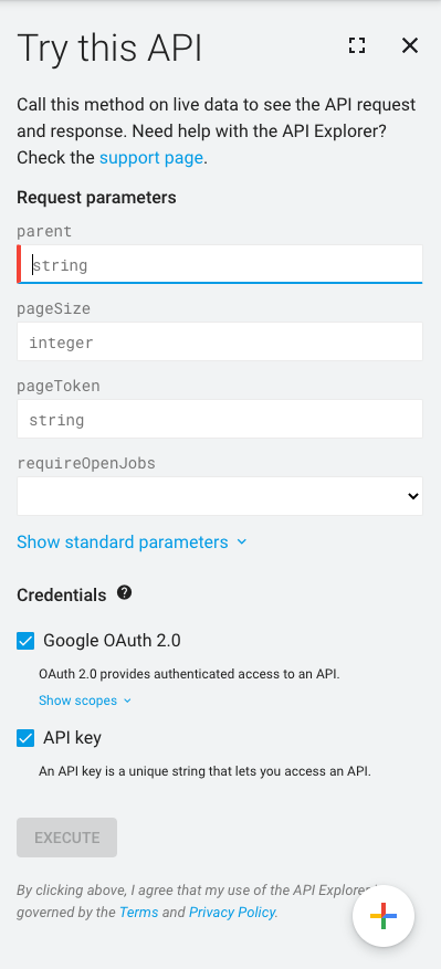 You can use the API Explorer tool to send trial requests to Cloud Talent Solution. The Explorer presents a form that shows the parameters for each method. Fill in the form, execute the API call, and see the results. You must have completed the "GCP Console set-up" section of the Before You Begin page before you can use API Explorer.