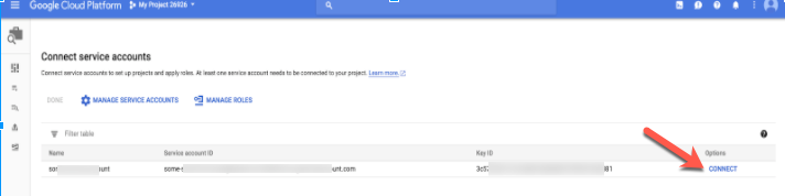 Si ya creaste cuentas de servicios para tu proyecto de Google Cloud, verás una lista de ellas aquí. En caso contrario, haz clic en MANAGE SERVICE ACCOUNTS (ADMINISTRAR CUENTAS DE SERVICIOS). Consulta Creaa una cuenta de servicio para obtener instrucciones.