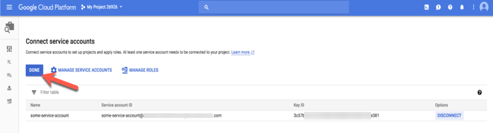Se já tiver contas de serviço criadas para o projeto do Google Cloud, você verá uma lista delas aqui. Caso contrário, clique em GERENCIAR CONTAS DE SERVIÇO. Consulte Como criar uma conta de serviço para ver instruções.