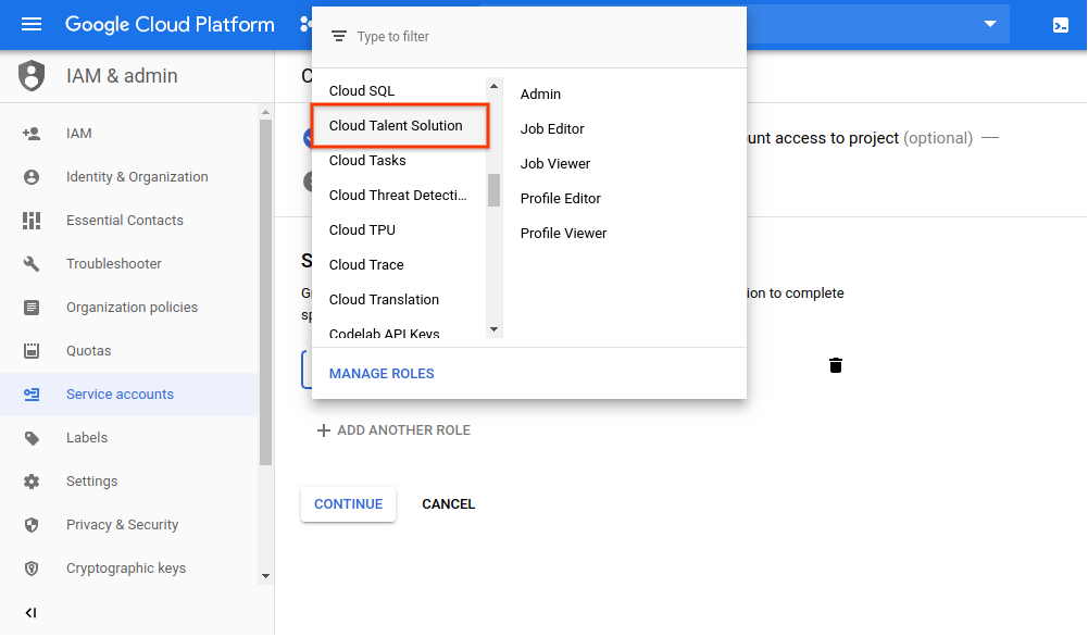 7. The next page allows you to assign a role to your new service account. See the CTS IAM permissions page for full details on the available roles and the permissions allowed to each. Click on the drop-down Select a role menu and scroll down to Cloud Talent Solution. You can choose a role for this service account from the options in the right-hand column:
