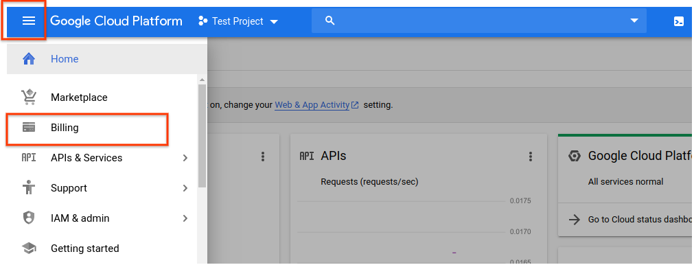 2. If you create a new project, you will be prompted to link a billing account to this project. If you are using a pre-existing project, make sure that you have billing enabled. You can access the project's billing information at any time by going to the main navigation menu (the hamburger icon in the upper left corner) and clicking the Billing option: