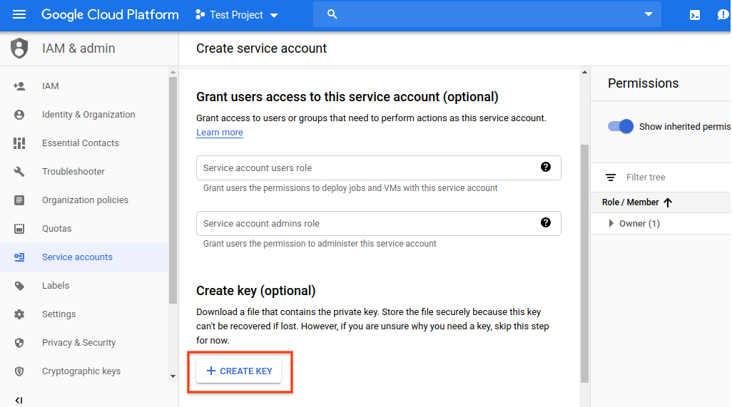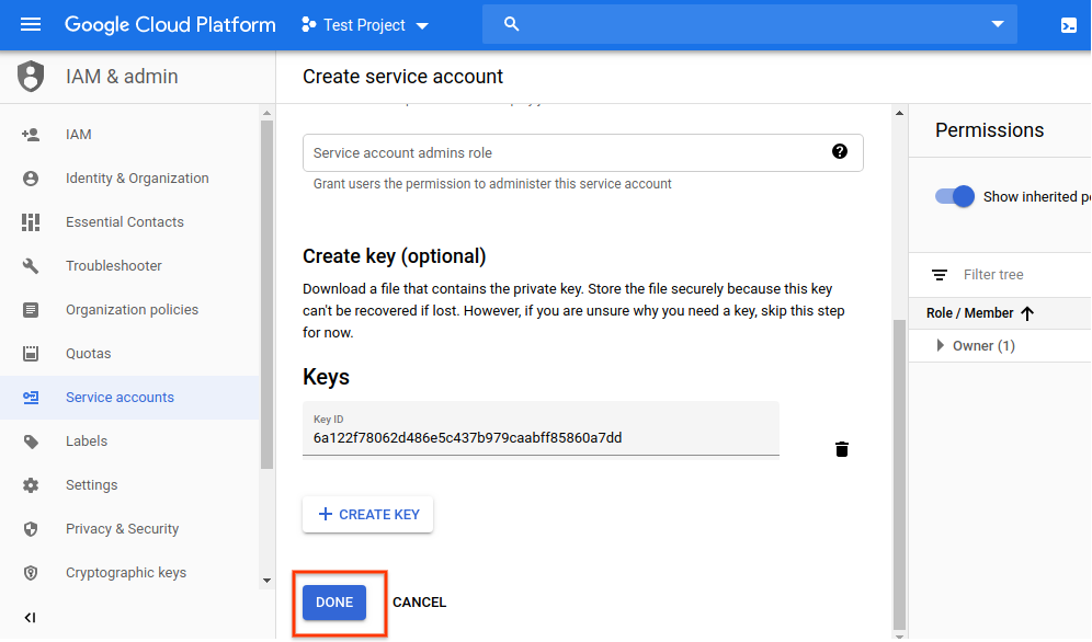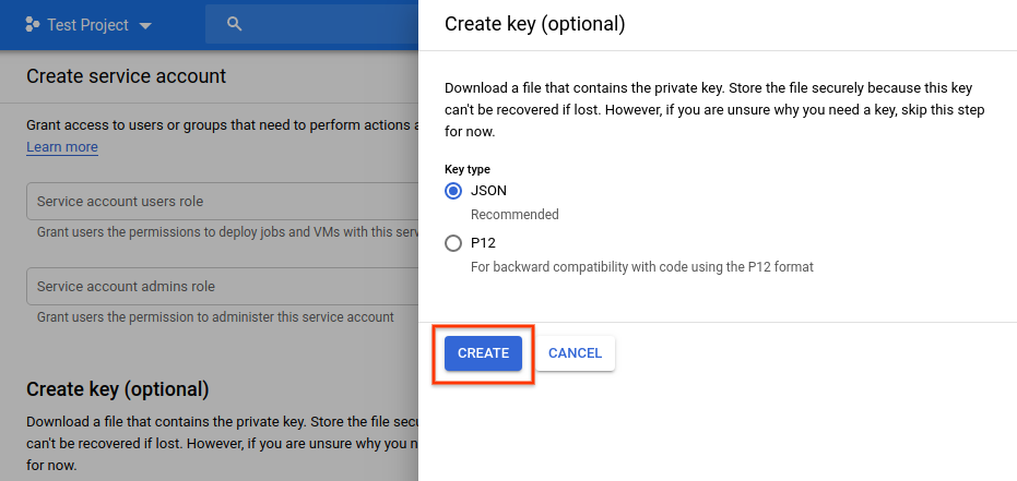 4. Download a service account credential key.