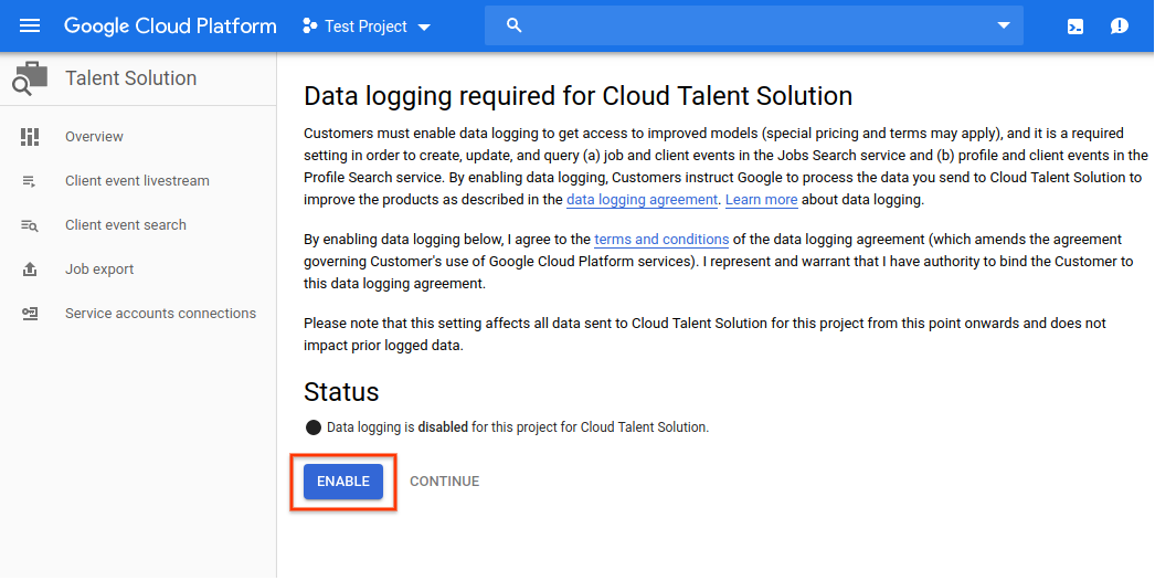 5. The data logging page appears. You must accept the terms & conditions to have full access to CTS features. If you choose not to accept these terms, you'll only be able to use deletion API requests. Click ENABLE: