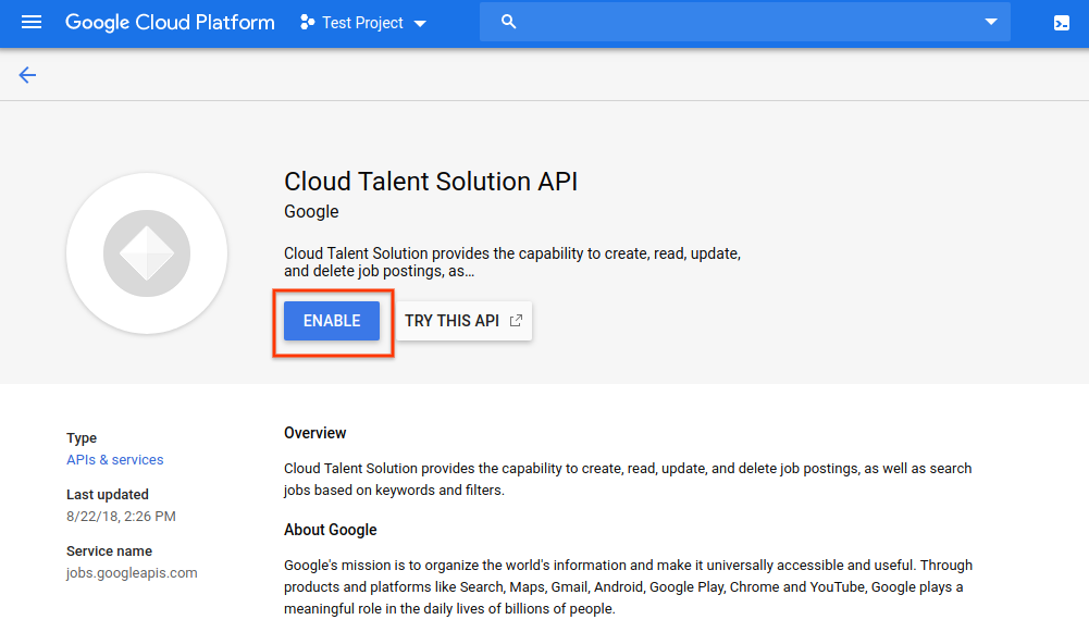 4. If you would first like to try the API without linking it to your project, you can choose the TRY THIS API option. See the Job Search API Explorer documentation for more information on using this feature. To enable the Cloud Talent Solution API for use with your GCP project, click ENABLE: