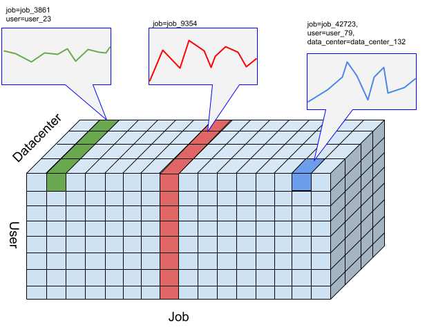 Timeseries Insights API menggunakan peristiwa sebagai entri data dasar. Setiap peristiwa memiliki stempel waktu dan kumpulan dimensi, yaitu key-value pair dengan kunci adalah nama dimensi. Representasi sederhana ini memungkinkan kita menangani data dalam skala triliunan. Misalnya, pusat data, pengguna, nama tugas, dan nomor tugas disertakan untuk sepenuhnya merepresentasikan satu peristiwa. Gambar di atas menunjukkan serangkaian peristiwa yang dicatat untuk satu tugas yang menggambarkan subset dimensi.