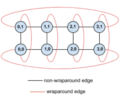 Los bordes de este gráfico de topología se muestran como bordes no dirigidos para mayor claridad. En la práctica, cada arista es una conexión bidireccional entre las TPUs. Nos referimos a los bordes entre un lado de esta cuadrícula y el lado opuesto como bordes envolventes, tal como se indica en el diagrama.