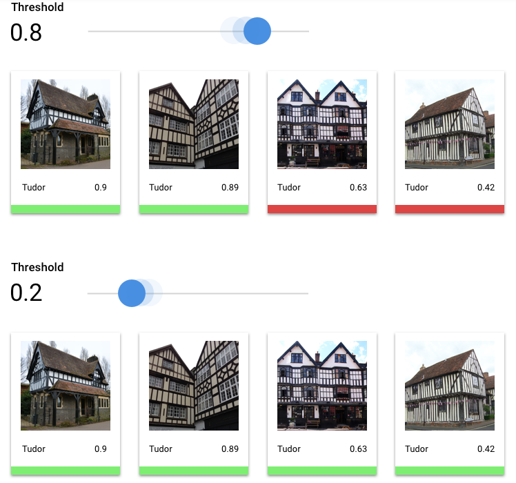 Depois de escolher um limite que pareça aceitável para o seu modelo como um todo, clique nas etiquetas individuais e veja onde esse limite se enquadra na respetiva curva de precisão-recall por etiqueta. Em alguns casos, pode significar que recebe muitas inferências incorretas para algumas etiquetas, o que pode ajudar a decidir escolher um limite por classe personalizado para essas etiquetas. Por exemplo, suponhamos que analisa o conjunto de dados de casas e repara que um limite de 0,5 tem uma precisão e uma capacidade de memorização razoáveis para todos os tipos de imagens, exceto "Tudor", talvez porque seja uma categoria muito geral. Para essa categoria, vê muitos falsos positivos. Nesse caso, pode decidir usar um limite de 0,8 apenas para "Tudor" quando chamar o classificador para inferências.