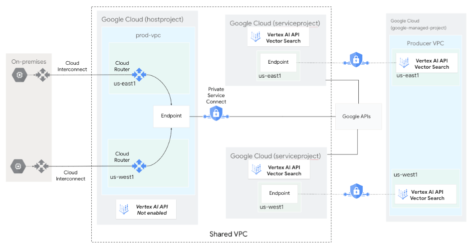 Some Vertex AI service producers require you to connect to their services through Private Service Connect endpoints. These services are listed in the Vertex AI access methods table. They support unidirectional communication from a service consumer's on-premises, multicloud, and VPC workloads to Google-managed Vertex AI services. Clients connect to the endpoint by using internal IP addresses. Private Service Connect performs network address translation (NAT) to route requests to the service.