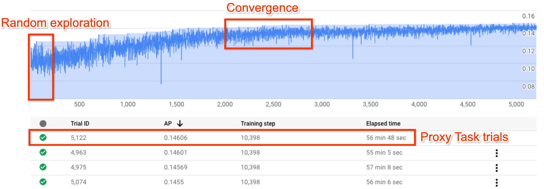 Jeder Test wurde als kleinere Version eines vollständigen Trainings namens proxy-task entworfen, das etwa ein bis zwei Stunden auf zwei Nvidia V100-GPUs ausgeführt wird. Der Kunde kann die Suche jederzeit manuell beenden und höhere Prämienmodelle im Vergleich zu seiner Referenz finden, bevor der Punkt der Konvergenz auftritt.
