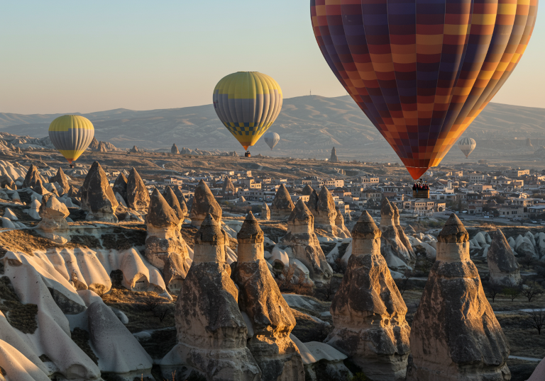 - Shot in the style of DSLR camera with the polarizing filter. A photo of two hot air balloons over the unique rock formations in Cappadocia, Turkey. The colors and patterns on these balloons contrast beautifully against the earthy tones of the landscape below. This shot captures the sense of adventure that comes with enjoying such an experience.