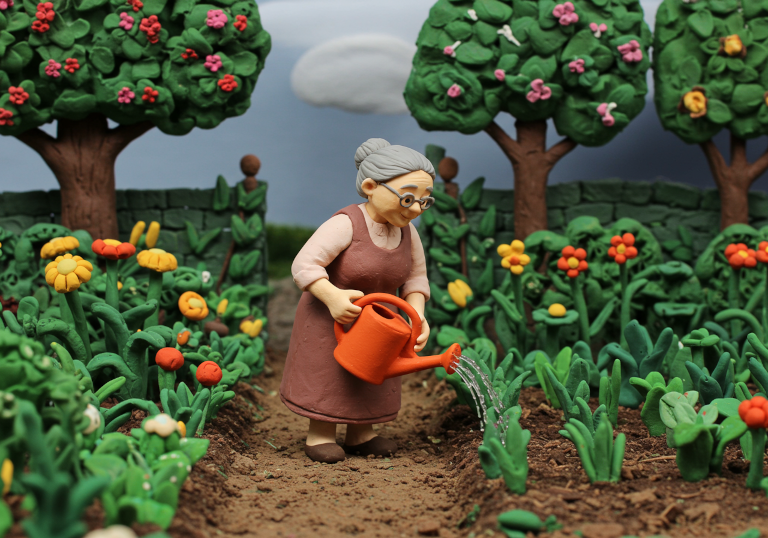 - Claymation scene. A medium wide shot of an elderly woman. She is wearing flowing clothing. She is standing in a lush garden watering the plants with an orange watering can