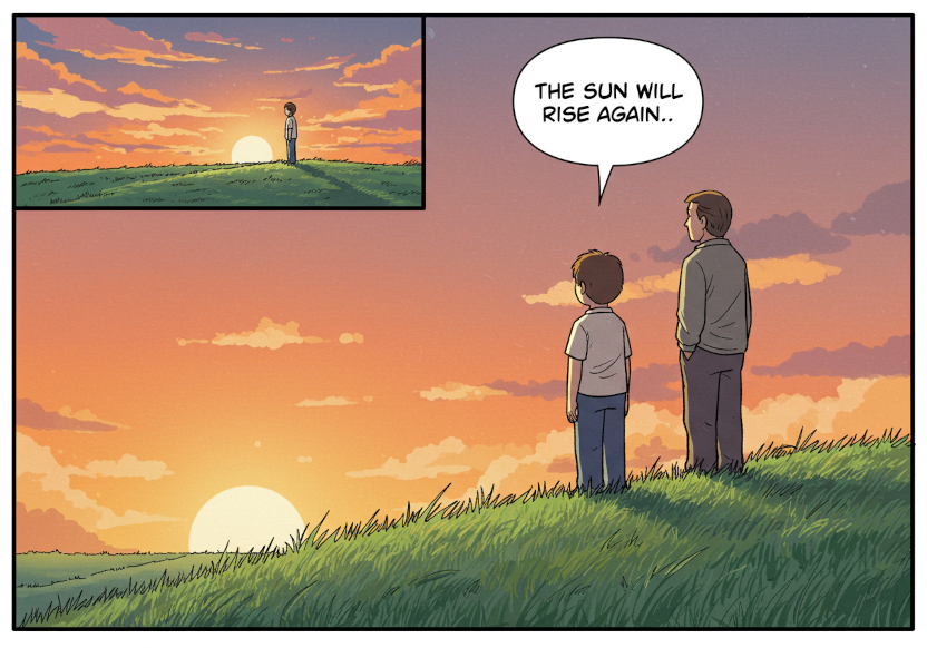 - A single comic book panel of a boy and his father on a grassy hill, staring at the sunset. A speech bubble points from the boy's mouth and says: The sun will rise again. Muted, late 1990s coloring style
