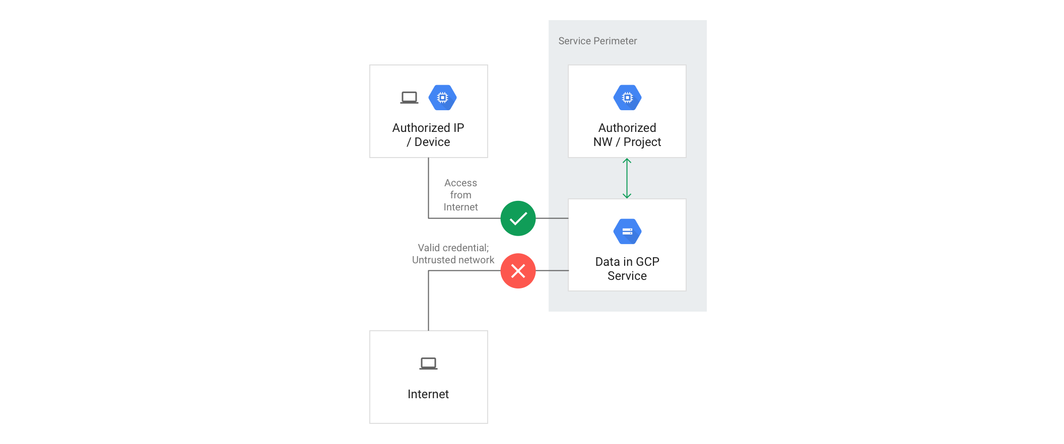默认情况下,从互联网访问服务边界内的代管资源将被拒绝。根据情况,您也可以视请求的上下文来启用访问。为此,您可以创建入站流量规则或访问权限级别,以允许基于各种属性(例如来源 IP 地址、身份或来源 Google Cloud 项目)进行访问。如果从互联网发出的请求不符合入站规则或访问权限级别中定义的条件,则会被拒绝。