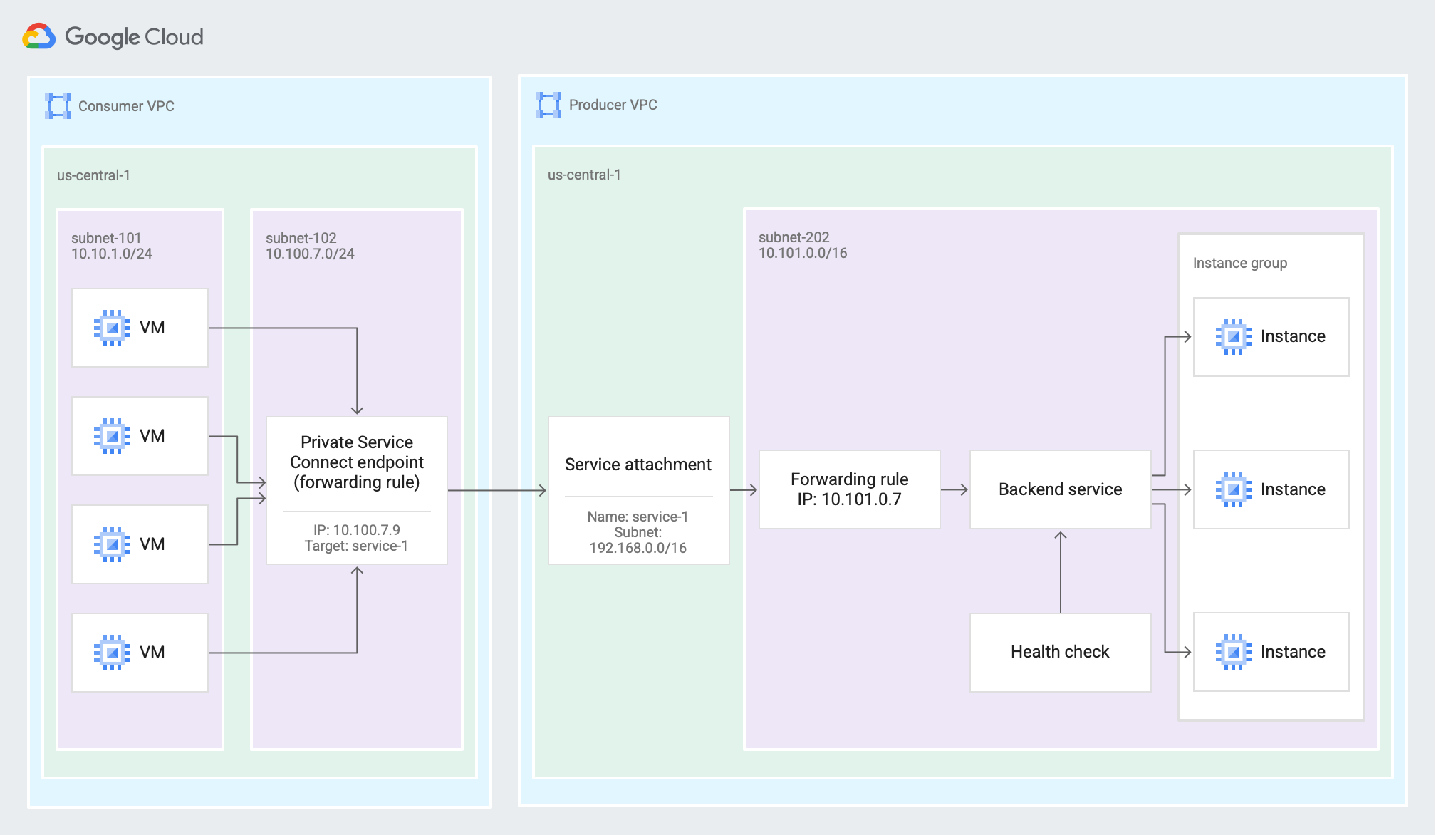 - 供應商負載平衡器的轉送規則會與共用虛擬私有雲網路中的 IP 位址建立關聯。轉送規則的子網路必須與服務專案共用。