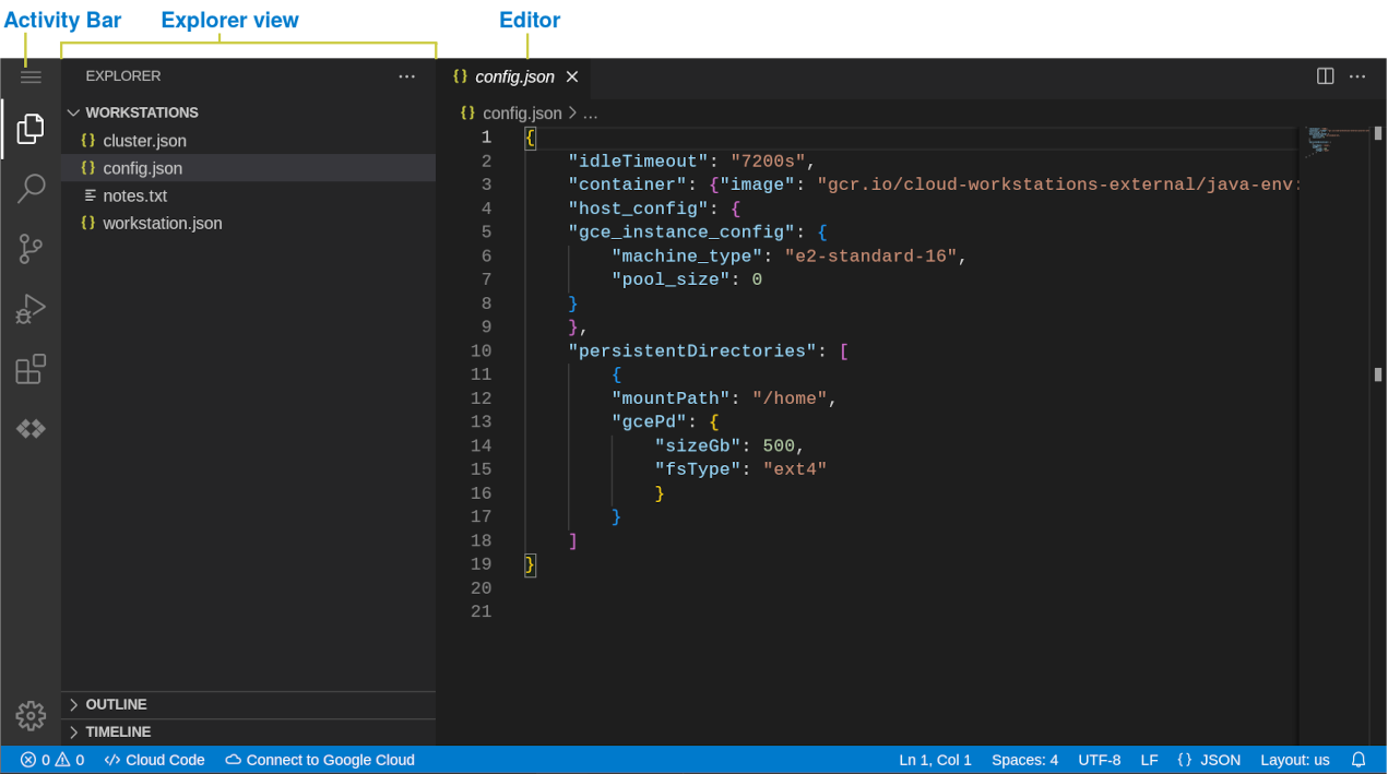 The Activity bar appears to the side and you can access the views available in the Cloud Workstations base editor. These Activity bar views are as follows:
