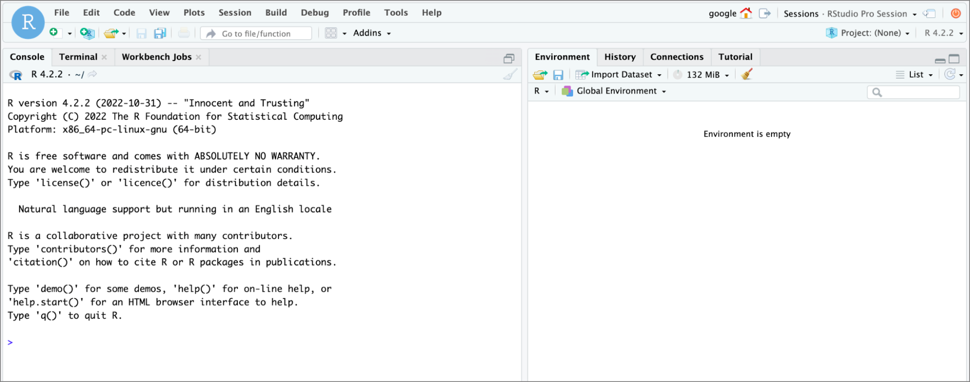 The following example shows the welcome page for the Posit Workbench. Your page might look different, depending on how your organization defines your workstation configuration:
